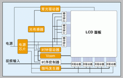 图1给出了LCD模块的典型电路。无论面板是设计用来做笔记本、台式电脑的显示器,还是应用在电视机上,所有这些功能都是必需的,但是每类产品的性能不一样。