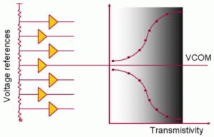 像素发出的光与施加到这个像素上的电压呈非线性关系,这个所谓的“珈玛曲线”(见图3)实际上是一个S曲线,它相对VCOM可以是正值,也可以是负值。事实上,大多数面板上的像素在两极之间交替切换,这样显示器上的平均电压值为0V,避免了与偏压相关的老化(burn-in)问题。由于每个面板都有不同的珈玛曲线响应,列驱动器需要一个参考曲线,这样它们能为每个像素提供合适的电压驱动,得到所需的亮度。一般采用珈玛缓冲器提供这种曲线,也可以用一串电阻模拟该曲线。